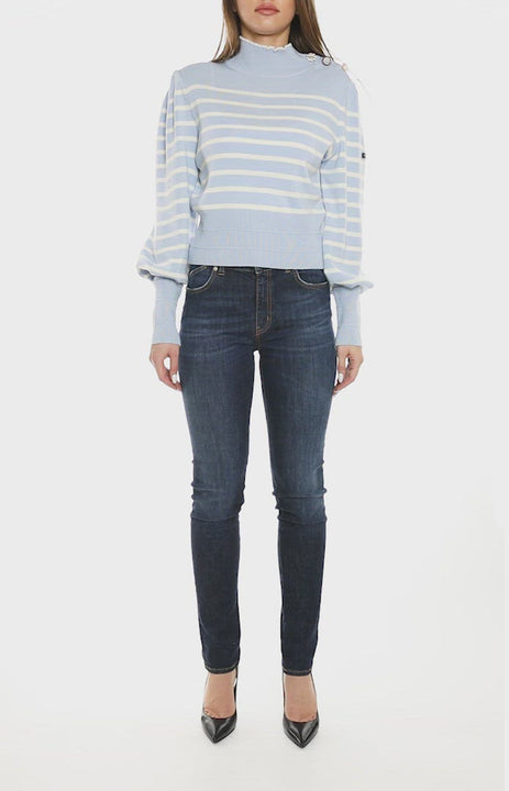 Lansata in anul 2000 si conceputa in special pentru tineri, linia Just Cavalli s-a dezvoltat rapid si se bucura astazi de colectii impresionante de haine, pantofi si accesorii. Cu design edgy si nuante vibrante, cu animal print-ul statement si modele inedite, piesele ce ii poarta semnatura sunt un must-have pentru orice impatimit al modei. Aceasta pereche de jeansi elastici este o piesa basic in garderoba oricariei fashioniste. Au talie medie si se muleaza pe silueta, asa ca ii poti combina cu un pulover scurt, cu maneci bufante, ca in imagine, pentru un look senzual.